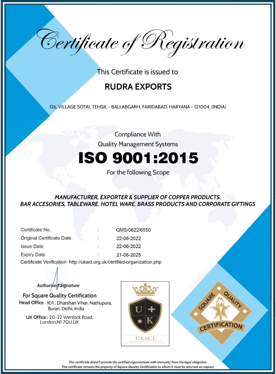 Leveraging on the vast experience of the industry, we, “Rudra Exports”, established in the year 2018 are among the distinguished organizations, engaged in exporting and Supplying quality range of Aluminium Buckets, Barware, Tableware, Dinnerware, Bar Sets, Beer Mugs, Beer Buckets, Candle Holder, Metal Vases, Traditional Diwali Gifts, Silver Plated Gift Items, Copper Jug, Copper water Bottle, Copper Bowls, Copper Glass & Tumblers, Copper Bedroom Bottles, Corporate Gifts, Christmas Ornaments etc. All these products are manufactured using modern machines and supreme quality material, which we source from authentic vendors of the market. These products are highly appreciated and demanded by the clients owing to features like durability, excellent finishing, elegant designs and resistance to corrosion.