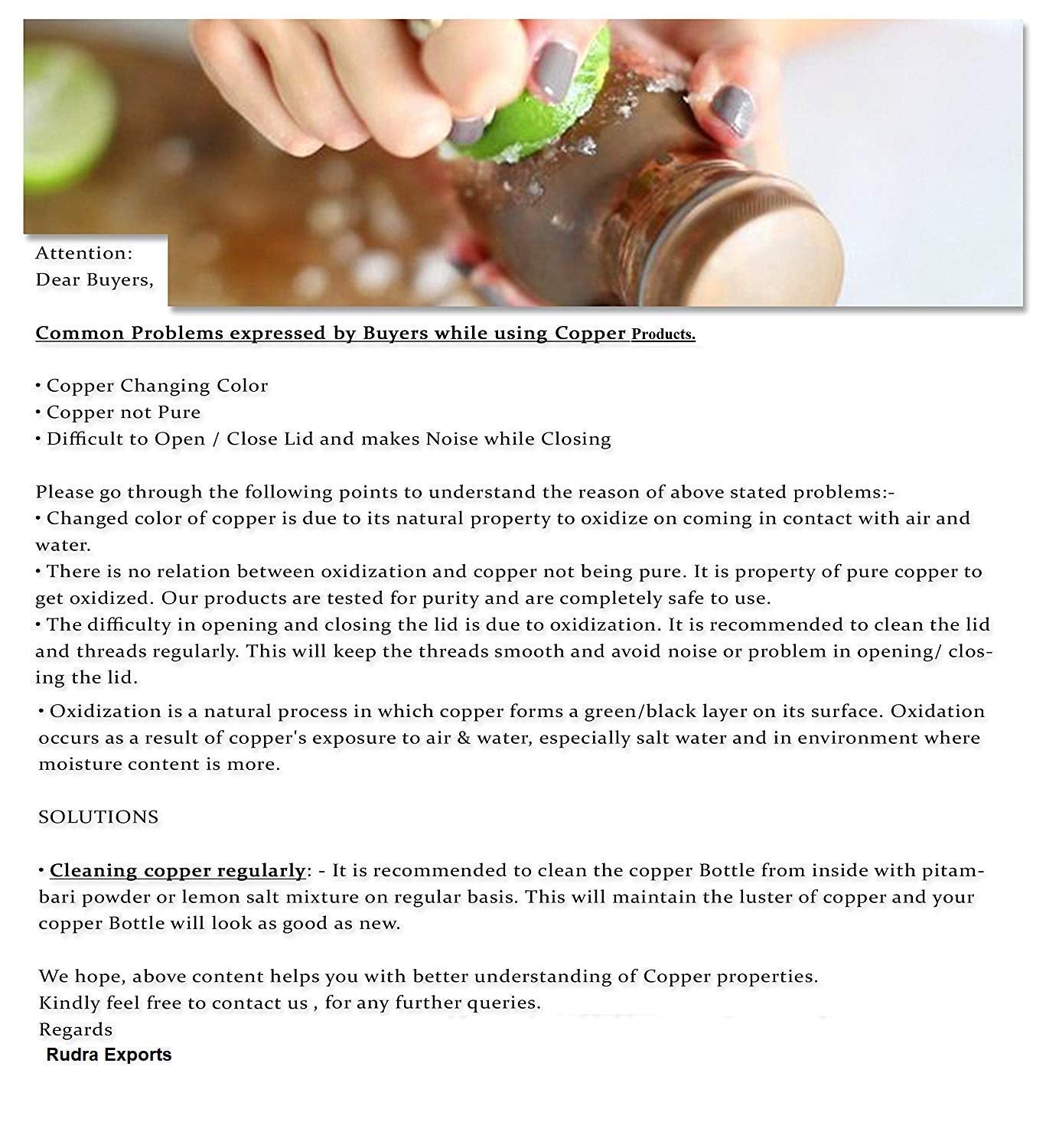 7 Serving dinner in this dinnerware handi would be unforgettable experience. Care Tips a) Clean your copperware by hand and avoid dishwasher as the detergent can cause oxidation leading to permanent damage. b) Use a solution of equal quantities vinegar or lemon juice and salt diluted with some water at such times but don't use it regularly. c) Avoid scratchy cleaners like steel wool. d)