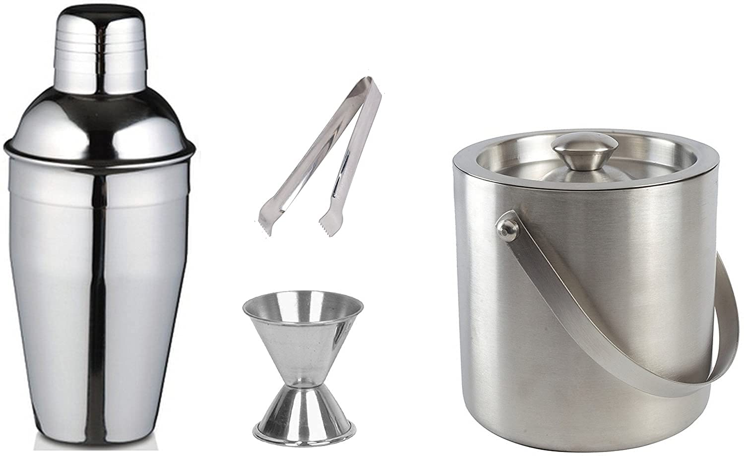 - 750 Ml cocktail shaker, 1 peg measure, Ice tong, ice bucke