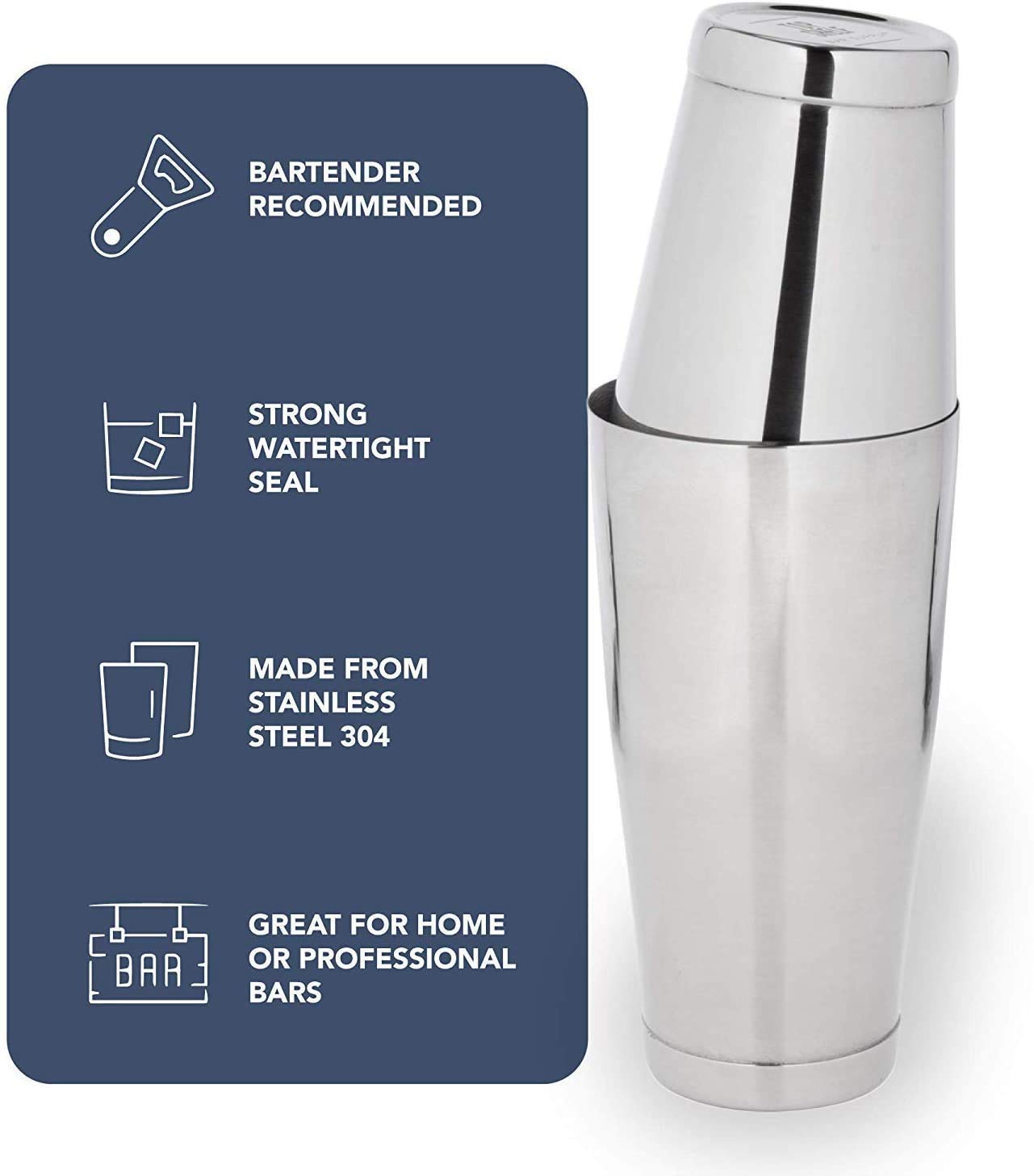 - ATTRACTIVE & PRACTICAL DESIGN - This heavy-duty bar set cocktail shaker set includes a perfectly weighted, 18 and 28 oz drink shaker tins, and a premium cocktail jigger with precise and accurate measurements,bar spoon,12in long muddler,strainer, ice tongs, 2 bottle stoppers and 2 liquor pourers. All carefully designed for balance and ergonomics.