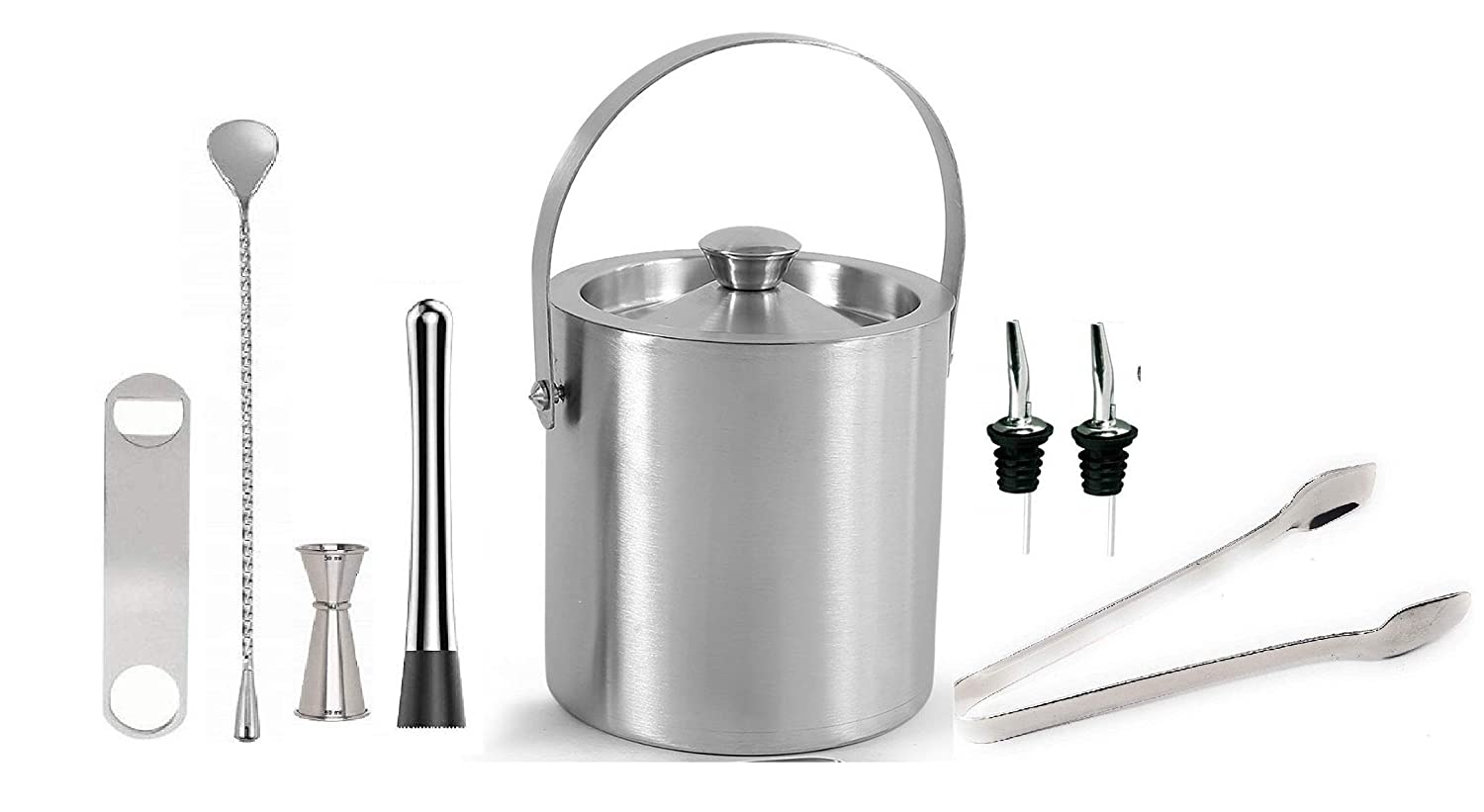Rudra Exports Bar Set for Drink Mixing Bar Tools: Ice Bucket Peg Measurer 30-60 ml Teardrop Bar Spoon Ice Tong Bottle Opener Pourer Muddler: 8 Pcs Set