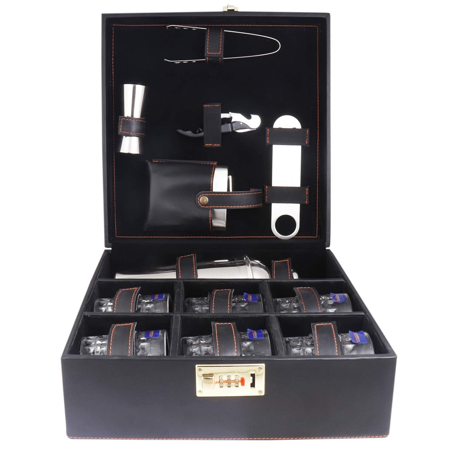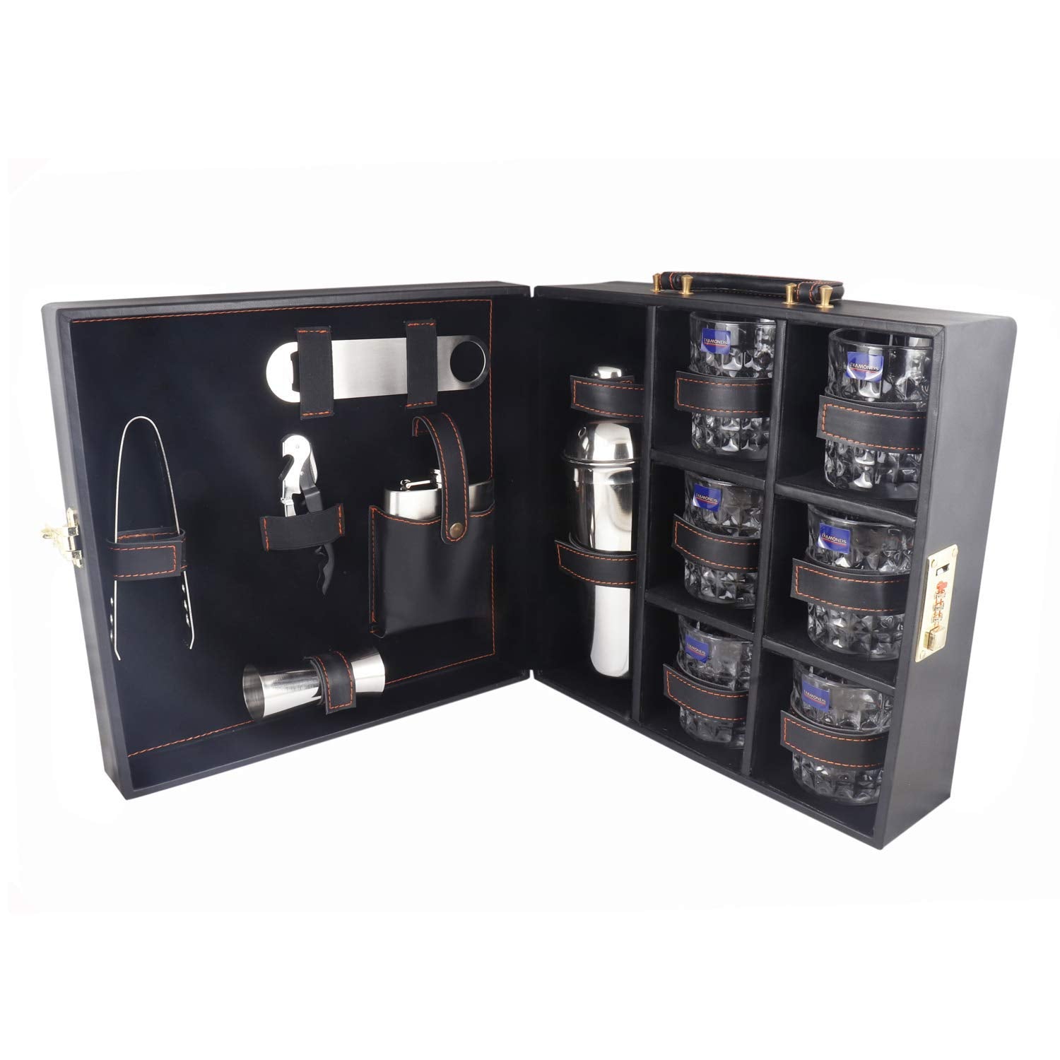- includes: - 6 Whisky Glasses,, Cocktail Shaker, Bar Spoon Fork, Wine Opener, Jigger, Hip Flask & Ice Tong Ideal for Gifting to your loved ones
