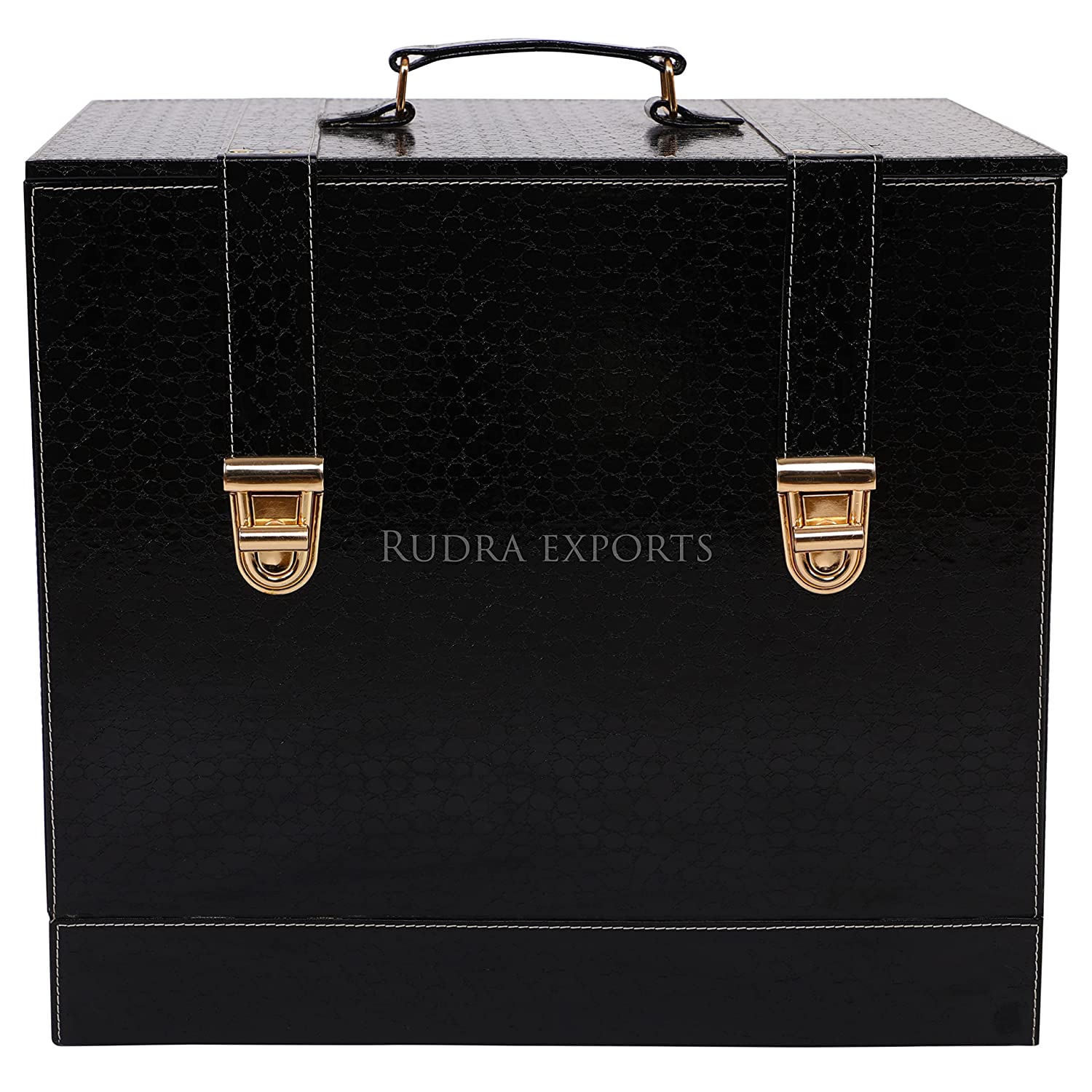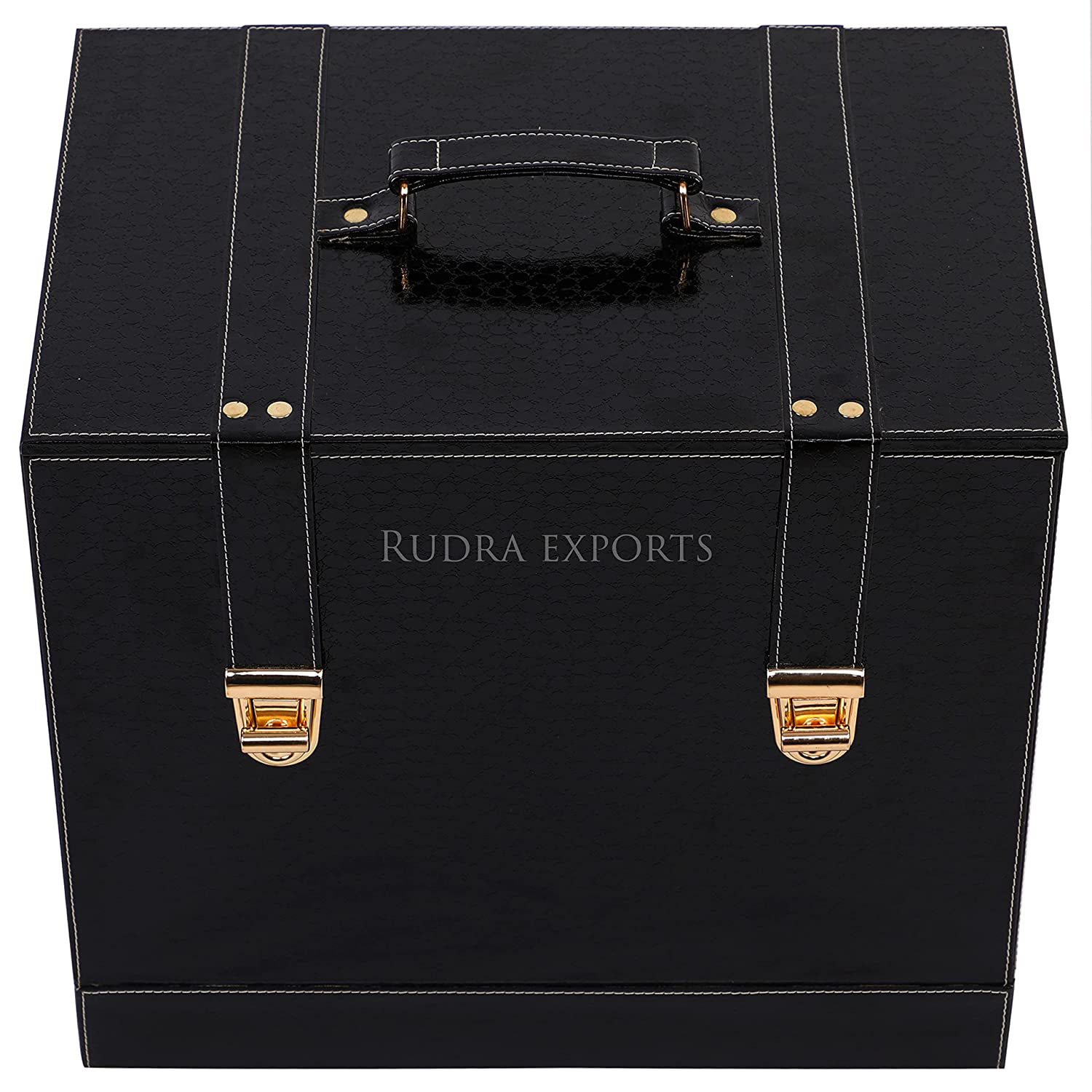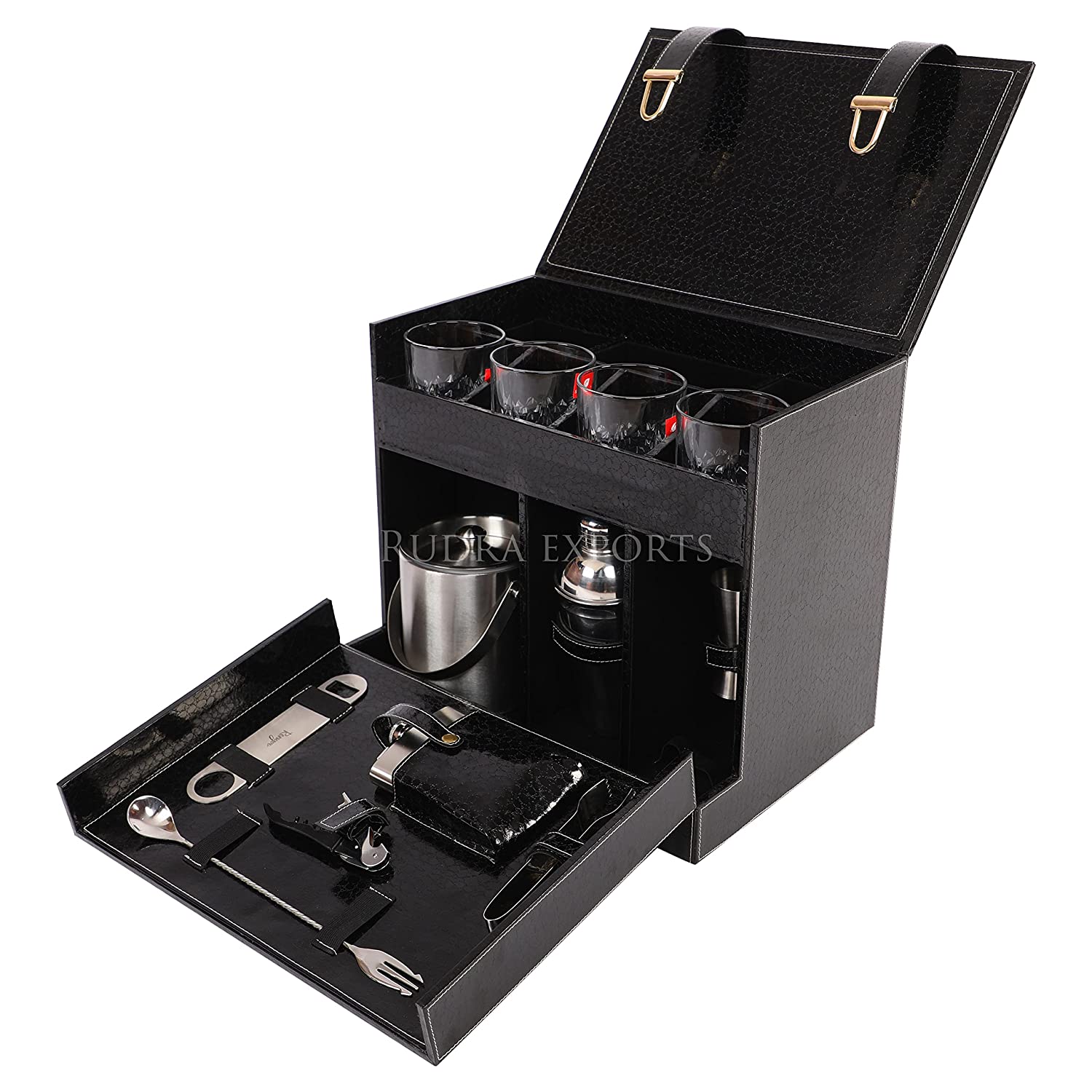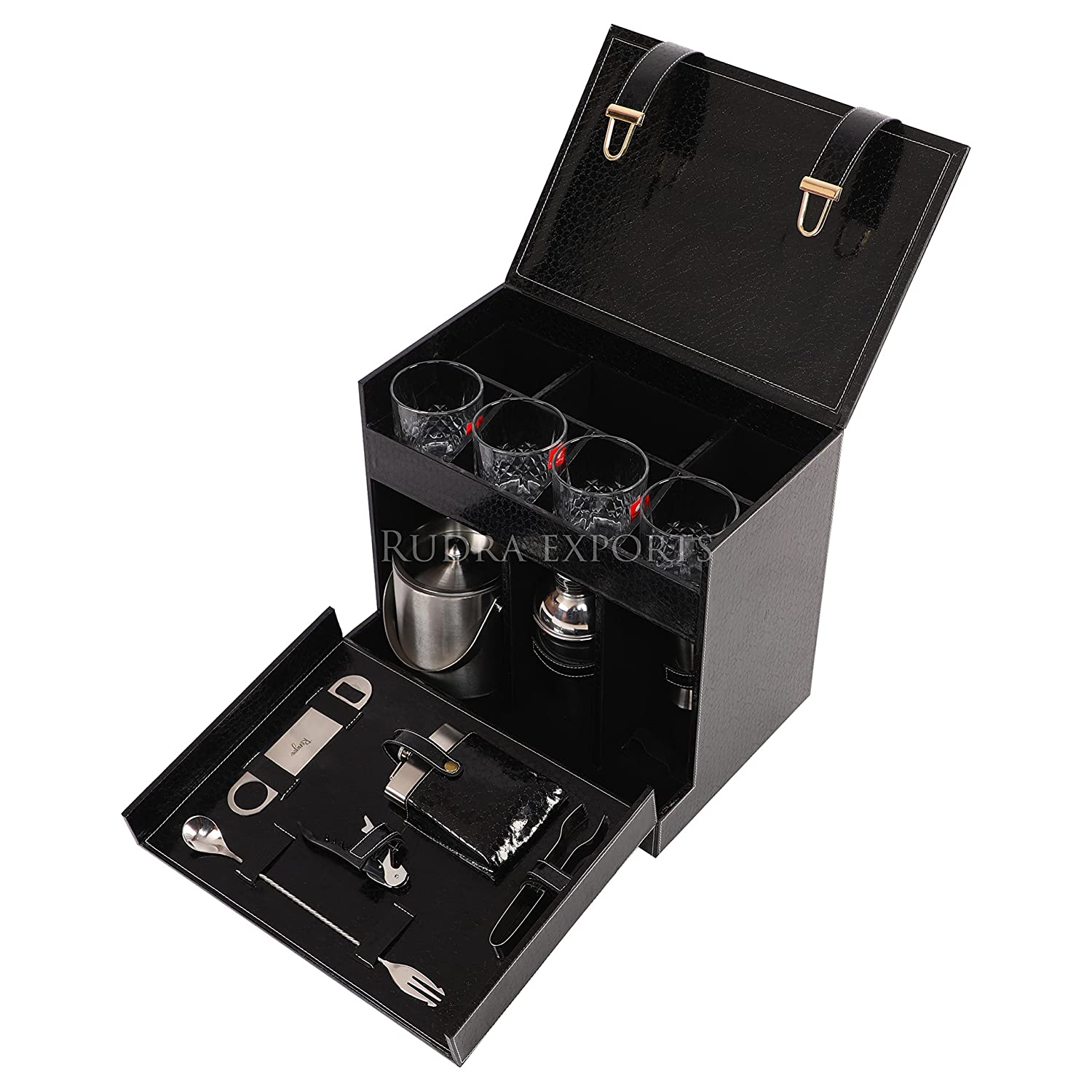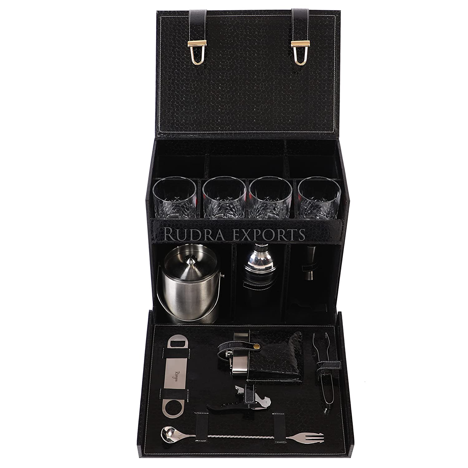 Rudra Exports Portable Bar Set, Travel Bar Set, Leatherette Portable Bar Box with Accessories Set & 4 Whisky Glasses | Mini Bar for Home (Black)