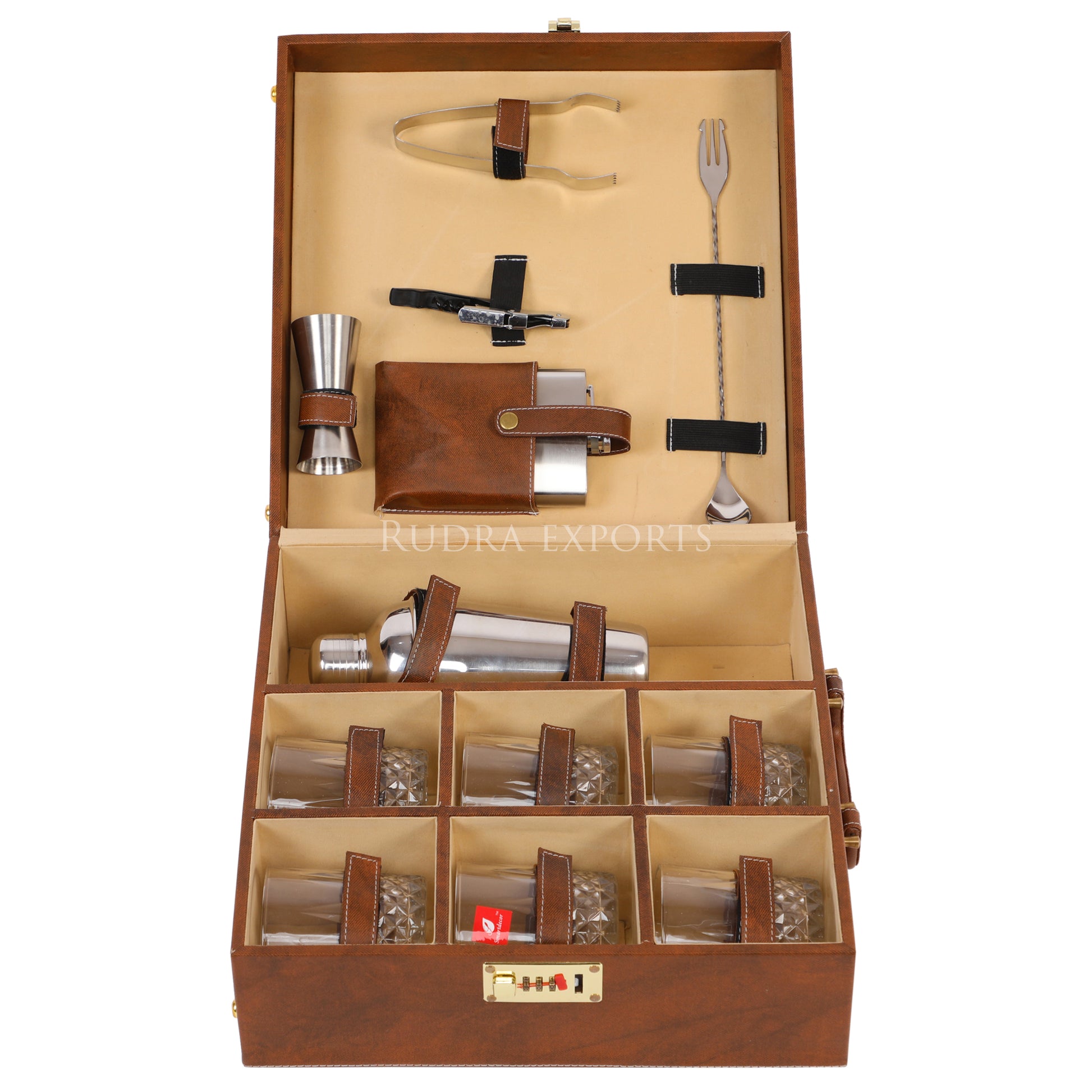 Rudra Exports Premium Bar Set with Bottle Handy Portable Leatherette Bar Set, Travel Bar Set for car | 6 Whiskey Glasses (Brown)